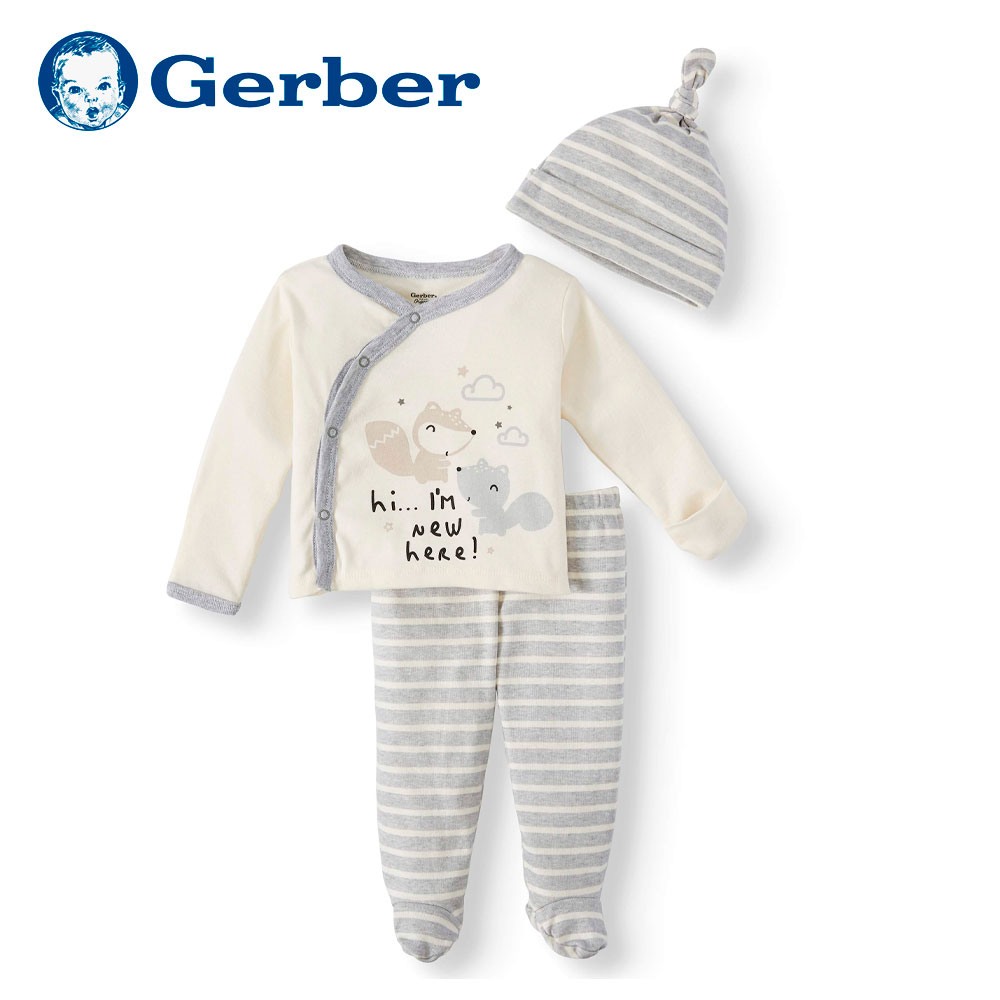 Suave y adorable, el lindo atuendo de tres piezas de Gerber para bebé es el look perfecto para darle la bienvenida a casa.