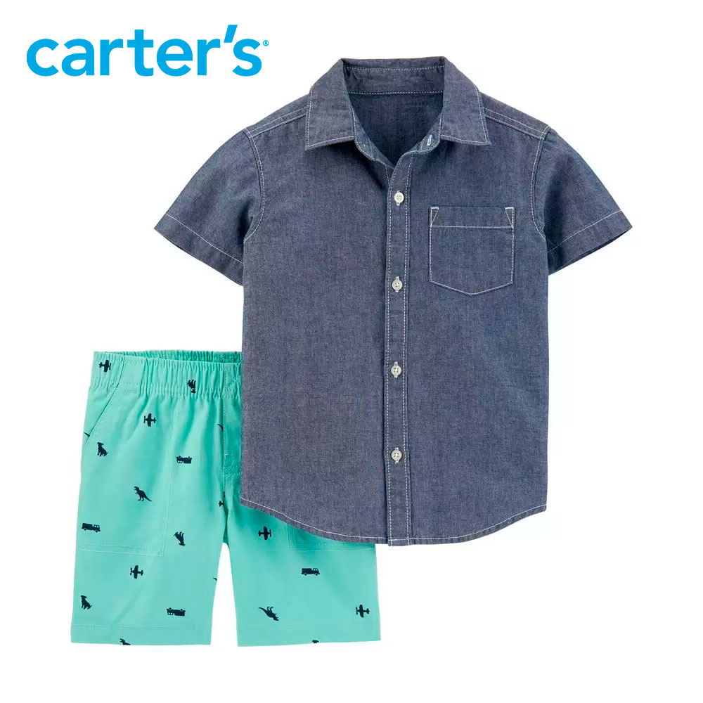 Confeccionado en algodón suave, este conjunto se completa con una camisa de cambray y un par de pantalones cortos a juego.