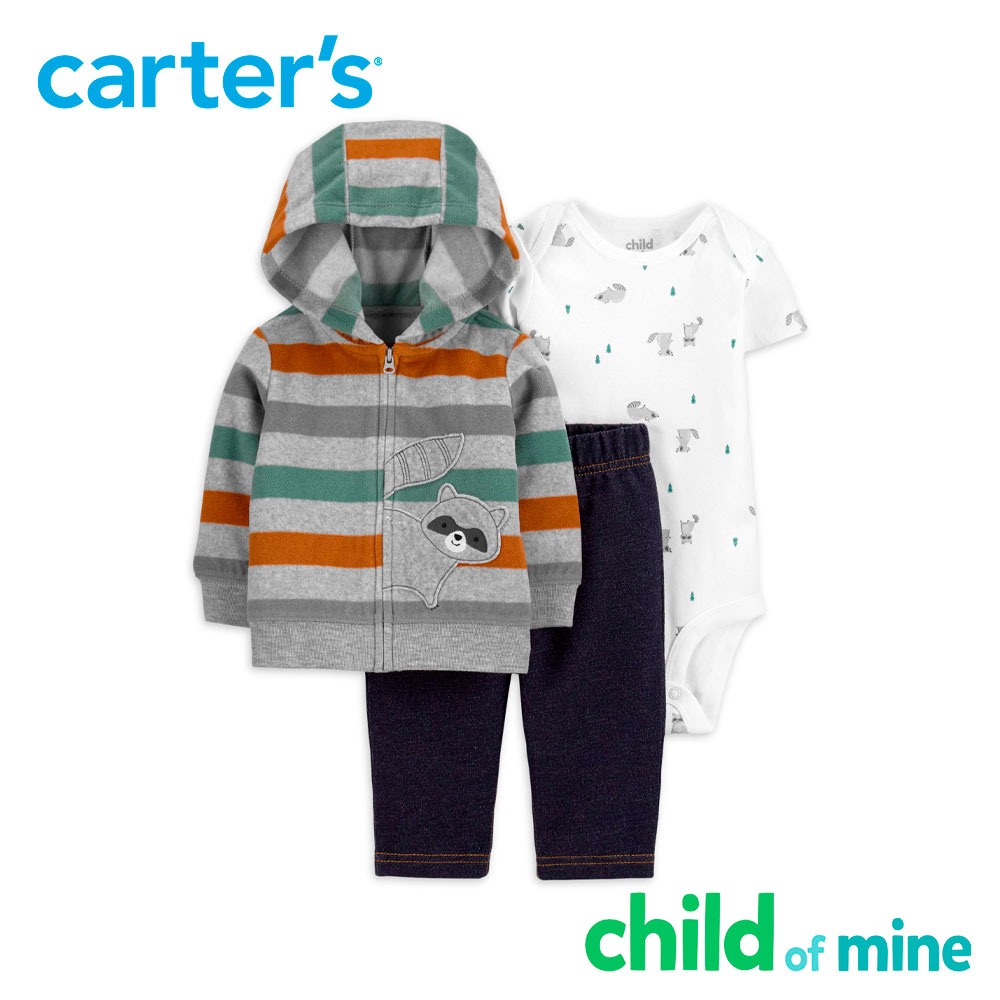 ¡Vestirse es muy fácil con un lindo conjunto de 3 piezas! De Child of Mine by Carter’s, este atuendo está listo para las aventuras diarias. Un body de manga corta de algodón suave presenta hombros expandibles y broches en las piernas para mantener los cambios rápidos. Además, los pantalones de tirantes hechos con felpa francesa similar a la mezclilla tienen una cinturilla elástica cubierta para un ajuste cómodo y sin pellizcos. ¡Ponte la chaqueta de lana a rayas con un divertido personaje de mapache y tu pequeño está listo!