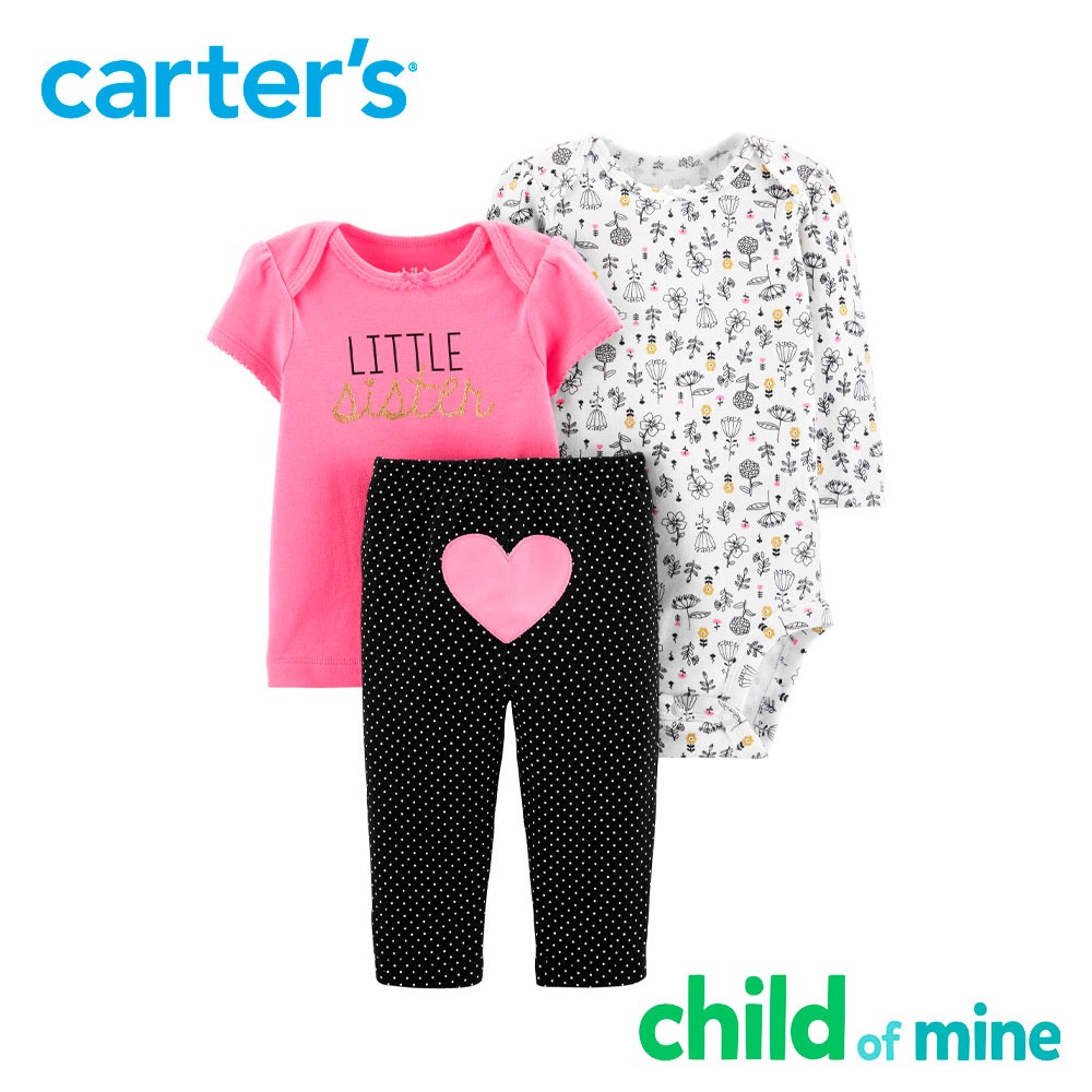 3 veces más estilo, 3 veces más fácil. Haz que tu pequeño se arme sin esfuerzo con el conjunto de 3 piezas Child of Mine by Carters que incluye una blusa, un mono y pantalones a juego.
