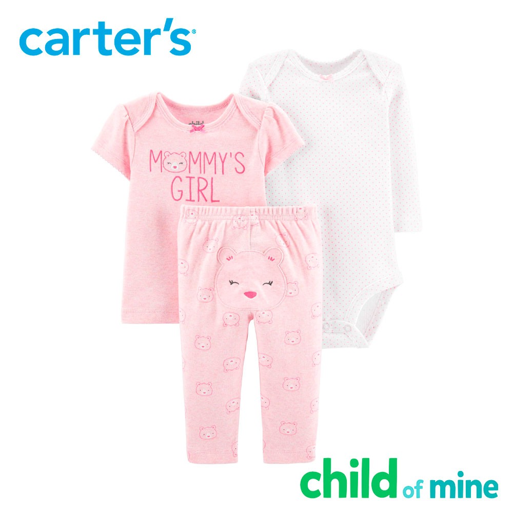 3 veces más estilo, 3 veces más fácil. Haz que tu pequeño se arme sin esfuerzo con el conjunto de 3 piezas Child of Mine by Carters que incluye una blusa, un mono y pantalones a juego.
